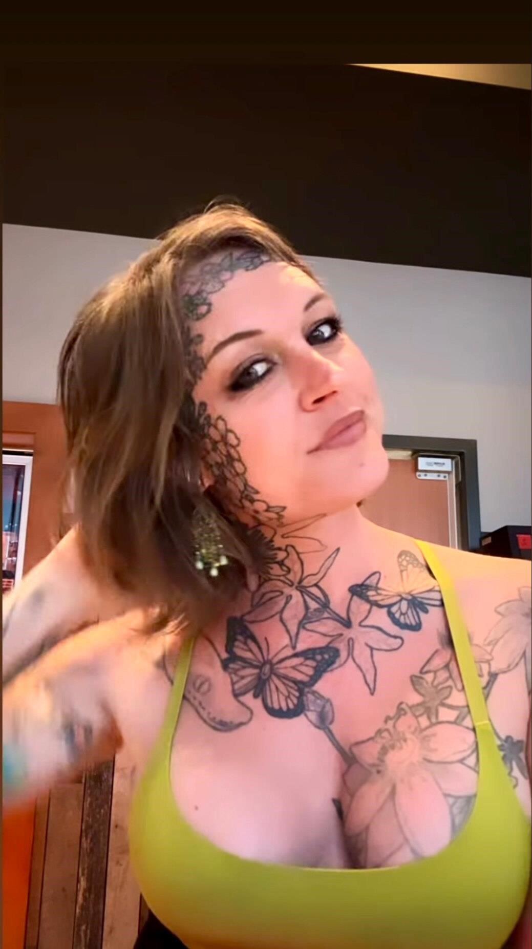 Tatted lady stroking and spreading her bunny pu$$y for the peoples.